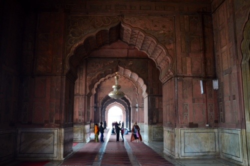 Das erste Ziel ist die Jama Masjid Moschee, wir fahren mit dem Taxi bis kurz vor die Moschee und kämpfen uns noch durch einen Markt mit verschiedensten Dingen, von Essen bis Gebetsteppichen für die Moschee. Auch diese Moschee wurde von Shah Jahan erbaut und 1650 eröffnet. Sie ist angeblich mit 90 mal 90 Meter Innenhof und den 40 Meter hohen Minaretten die größte Moschee Indiens, die große Freitreppe am Haupteingang ist schon echt Ehrfurcht gebietend. Wir tapern rauf und geben unsere Schuhe am Eingang ab und zahlen ein Fotokameraentgelt in Höhe von 300 Rupies, der Eintritt ist frei. Wir kommen durch das Haupttor und der Platz ist wirklich riesig, die Moschee bietet Platz für 20.000 Gläubige, Wahnsinn.