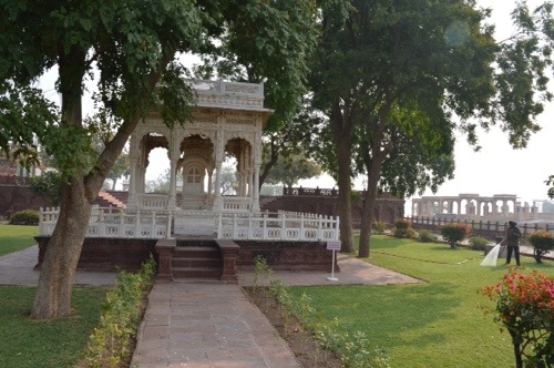 Der Jaswant Thada Tempel ist eine Augenweide, aus weißem Marmor ist er zugleich Andenken und Grabmahl des Maharaja Jaswant Singhji (1873-1895), es steht an einem kleinen See mit Badesteg und um den Tempel herum, lieg ein wunderschöner Garten. Hier oben lässt einen die Ruhe und Schönheit dann auch den Trubel und das Chaos dieser Millionenmetropole Jodhpur vergessen. Wir genießen die Ruhe und nutzen die Gelegenheit einen Raubvogel (Milan?) bei der Jagd zu beobachten. Er zieht seine Kreise über den hinteren Gärten und stößt immer wieder herunter, zum Teil fliegt er nur wenige Meter über uns hinweg. Anschließend hören wir noch einem Musiker zu der auf seiner Quetschkommode spielt und dazu ein Lied auf “Olimaaaar” jault. Wir schießen noch ein paar Bilder und schlendern zurück zum Tuctuc, um zum Fort weiter zu fahren.