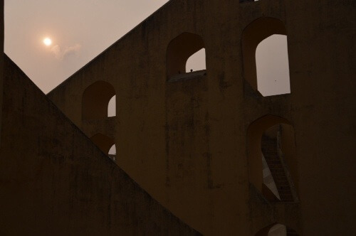 Erstmal heißt es anstellen! In Indien lernt man warten. Ca. 15 Minuten stehen wir an um die Eintrittskarte zu erlangen. Wir wählen ein 2-Tage-Kombiticket für 350 Rupien, mit dem wir uns dann morgen weitere Sehenswürdigkeiten anschauen können. Und rein in die Sternwarte – aber nix ist mit Sternen oder Sonnenkonstellationen angucken. Drinnen ist es voll wie auf ‘nem Rummel und die Sonne ist vom dichten Dunstschleier verdeckt, geschweige denn man könnte tags schon Sterne sehen. So flüchten wir in eine nicht so stark frequentierte Ecke und lassen es erstmal wirken. Es ist schon ein tolles Bauwerk, wer da war kann das Bestätigen, alle anderen müssen einfach mal hin. Nach dem wir uns umgesehen haben und ich mich mit netten Inderinnen hab fotografieren lassen müssen 😉 ziehen wir weiter zum Palast der Winde. Leider ist um 16:30h die Eingangstür für die Aussichtsterrasse schon zu und deshalb kommen wir nur dazu uns die Fassade anzugucken. Aber, der schlaue Inder ist ein Fuchs: um uns in seinen Schmuck-Fuchsbau zu locken, gibt er uns die Möglichkeit von seiner Dachterrasse gegenüber einen tollen Fotospot nutzen zu können. So kommen wir zu einen unversperrten Anblick auf die tollen Front des Palastes und zahlen hinterher mit einer Führung durch seine Goldstube. Was ein Ausblick! Danke!